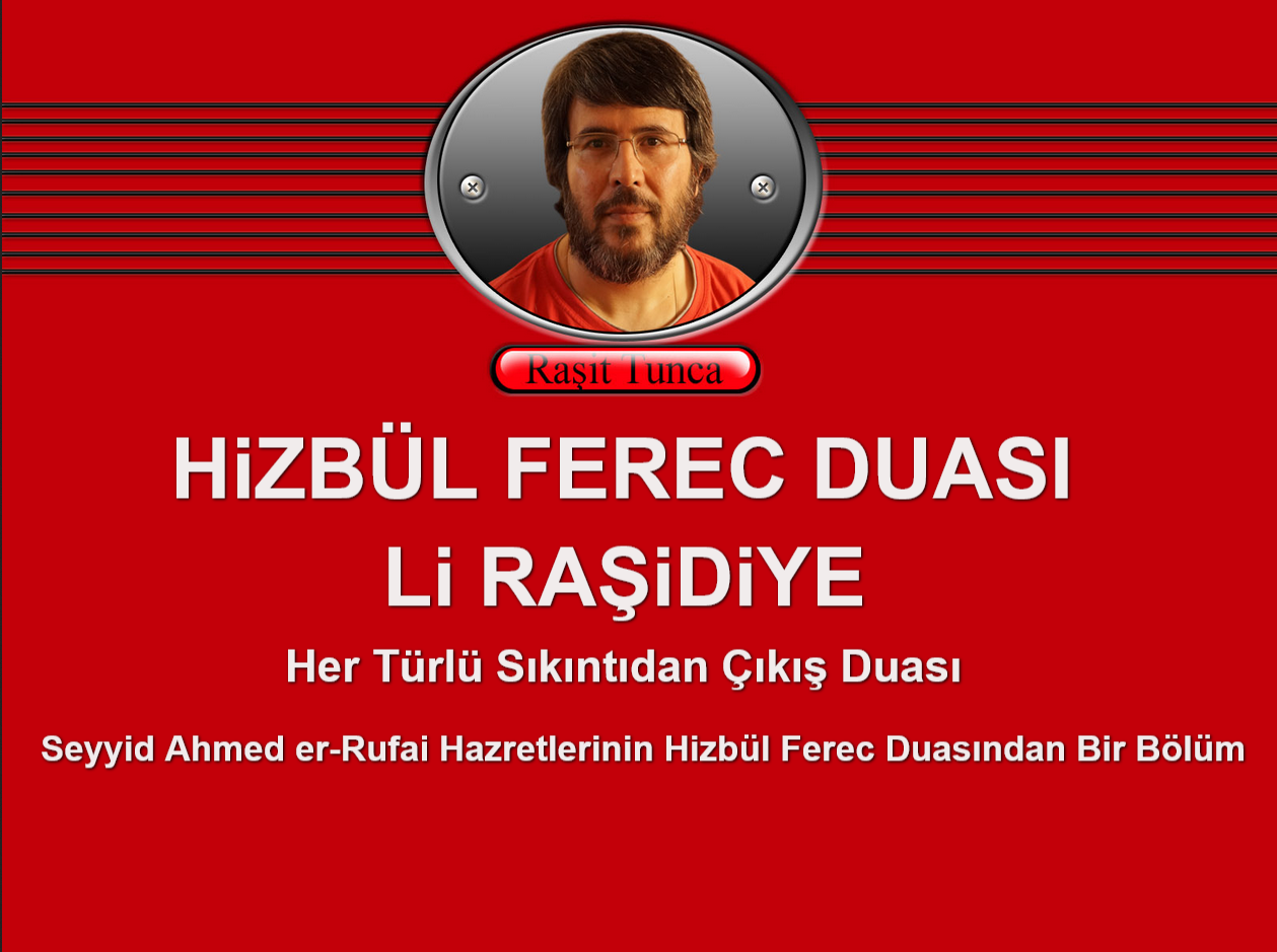 FEREC DUASI Li RAŞiDiYE Seyyid Ahmed er-Rufai Hazretlerinin Hizbül Ferec Duası FEREC DUASI HAKKINDA Ferec duası, sıkıntı, keder ve zorluklardan kurtuluş, ferahlık ve çıkış yolu bulmak için okunan, “Allah’ım! Sıkıntımızı gider, bize kolaylık ver, ferec (ferahlık, çıkış yolu) nasip et”…